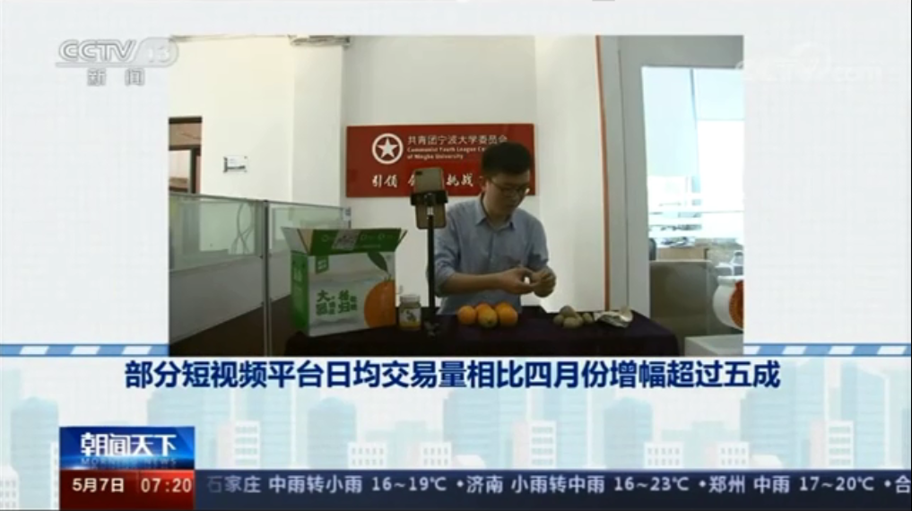 5月7日,央视《朝闻天下》栏目播出宁大百名师生为湖北农民直播带货的新闻,画面为我校团委青年团干向网友推荐秭归脐橙。